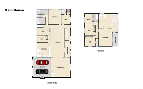 一层有三个卧室,两个浴室,厨房,写字间,客厅,起居室